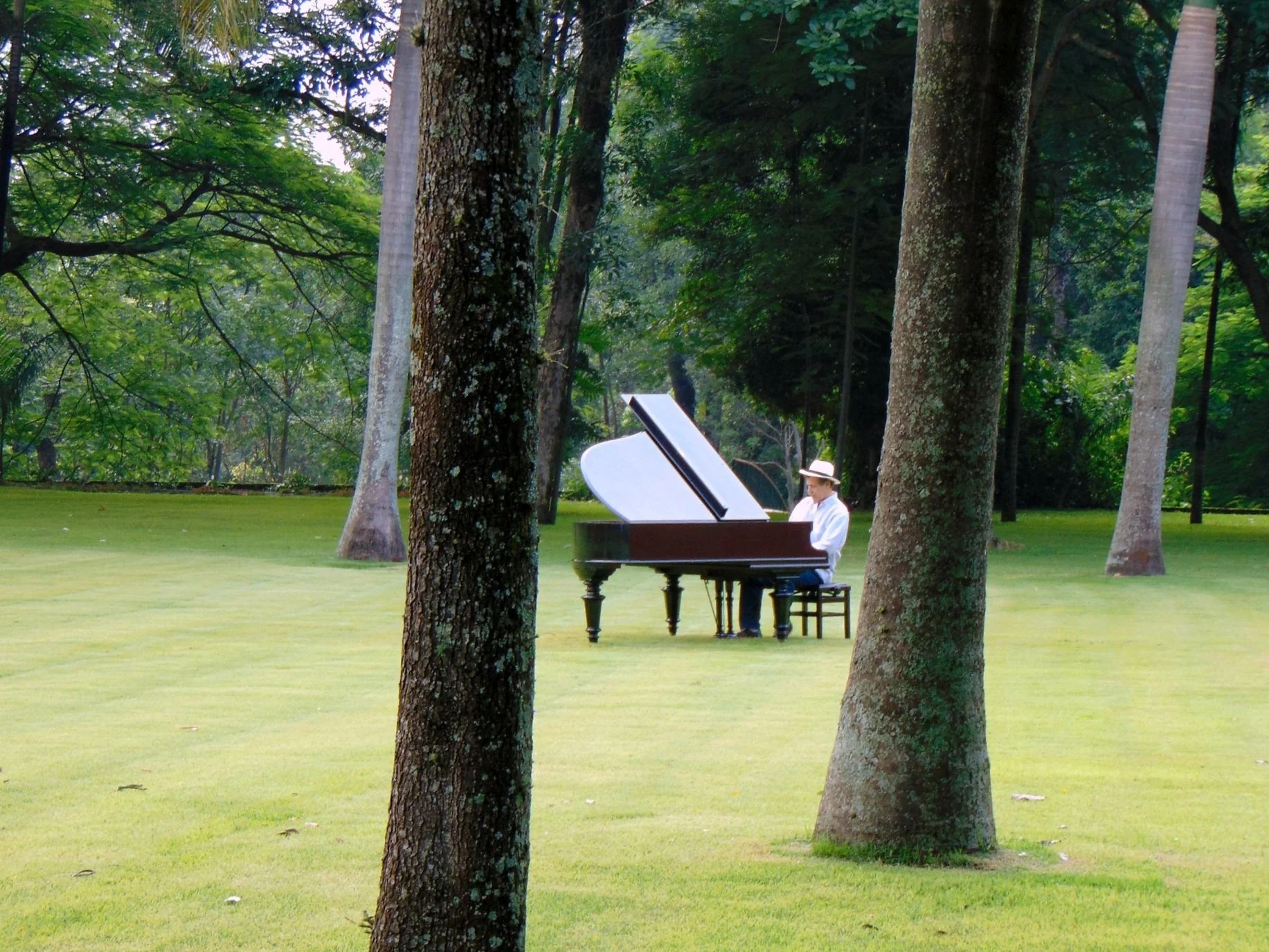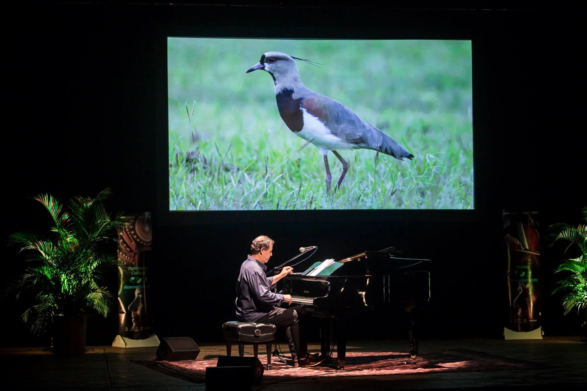 While Florence, motivated by the desire to capture and transcribe all the sounds he could find, pioneered the development of zoophony, my experience on that farm provoked an insight in another direction: I imagined how good it would be to create music talking to nature, how many musical ideas could emerge, how many animals sounds and images could be captured. I started to turn these ideas into reality through some preliminary musical experiences, and finally, after some time, the concept of ecomusica was defined and it became a personal artistic project - the EcoMusica Project - which would embrace different artistic creatios within this new context. The first of them was the album EcoMúsica Dialogues Between a Piano and the Brazilian Fauna, released in 2015. After researching in the Jacques Vielliard Neotropical Phonoteca collection, at Unicamp, SP, I selected 14 recorded samples of animals’ sounds, that had potential for musical interaction. Then, in my study room, listening to the sounds repeatedly, I started creating different conversations between the piano and the material, with total freedom, improvising, testing and evaluating the results. After 30 days, I found that the musical conversation structures were ready. The next step, already in the recording studio, using headphones and listened to the sounds in looping, I started my work on the piano and improvised with freedom, having, however, as a base, a series of structures that had already been tested throughout the previous practice. Then, 14 long conversations with different were created. I can say that, on average, each conversation lasted approximately 15 minutes, each one with one or more takes. Finally, during the editing process, I made a selection of the best parts. I chose to limit the maximum length of each track to approximately five minutes. During the editing process, which lasted about two weeks, I also did the sound design - the in and out curves of the animal sounds, the dynamics and equalization of the sounds - establishing the final shapes so that each conversation would be as instigating as possible. In some of these conversations, the piano appears as the protagonist, in others, the sound of the animal, sometimes both are soloists. Today, analyzing the whole result, I can say that the process was quite intuitive and I realize that the procedures used were quite varied, with occurrences of rhythmic synchrony, question and answer, harmonization of the animal sounds, counterpoint, sound amalgam, melodic reproduction, imitation, rhythmic reproduction, contrast of registers and contrast of dynamics. The 14 tracks in the album are named after the sounds of the following representatives of Brazilian fauna: Cigarra, Bem-te-vi, Tico-tico, Sapo-cururu, Quero-quero, Grilo, Uirapuru, Tangará, Araponga, Anu-branco, Canário-da-terra, Tuim, Sabiá, and Arara-azul. The graphic design of the album was created by the artist Guto Lacaz, in charge of designing a cover in which are reproduced several paintings of birds on tiles, a memento from my father, the one that gave me the passion for nature. This CD had three editions (one released in Japan and two in Brazil), one of the Brazilian editions was commissioned by the Botanical Garden of Rio de Janeiro. In 2015, about 100 copies of the album were distributed to participants of the United Nations Climate Change Conference - COP 21 - in Paris, by the Brazilian Ministry of Environment.
